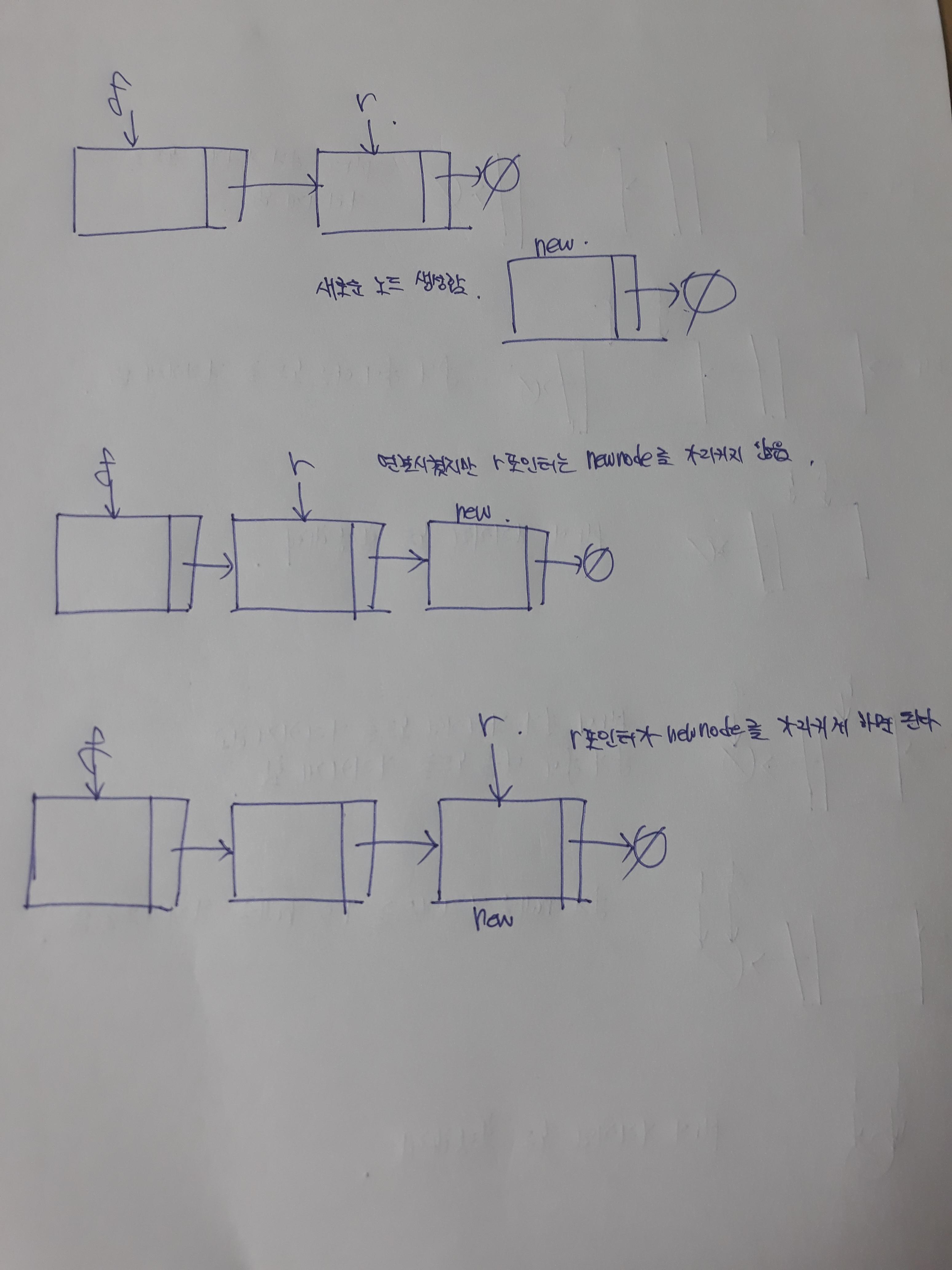 따라서 enqueue작업을 할 때 만약 큐가 비어있는 상태였다면 포인터 f, r을 새로 만든 노드를 가리키도록 합니다. 그리고 비어있지 않다면 먼저 r의 next가 new_Node를 가리키도록 합니다. 그 후에 여전히 r이 추가한 노드 이전을 가리키고 있는 상태겠죠? 따라서 갱신을 하기 위해서 r을 다시 new_Node를 가리키도록 합니다. 이렇게 해서 연속적으로 enqueue작업을 할 수 있습니다. 이 과정을 좀 더 이해하기 쉽게 제 허접한 그림실력으로 표현해보았습니다.....